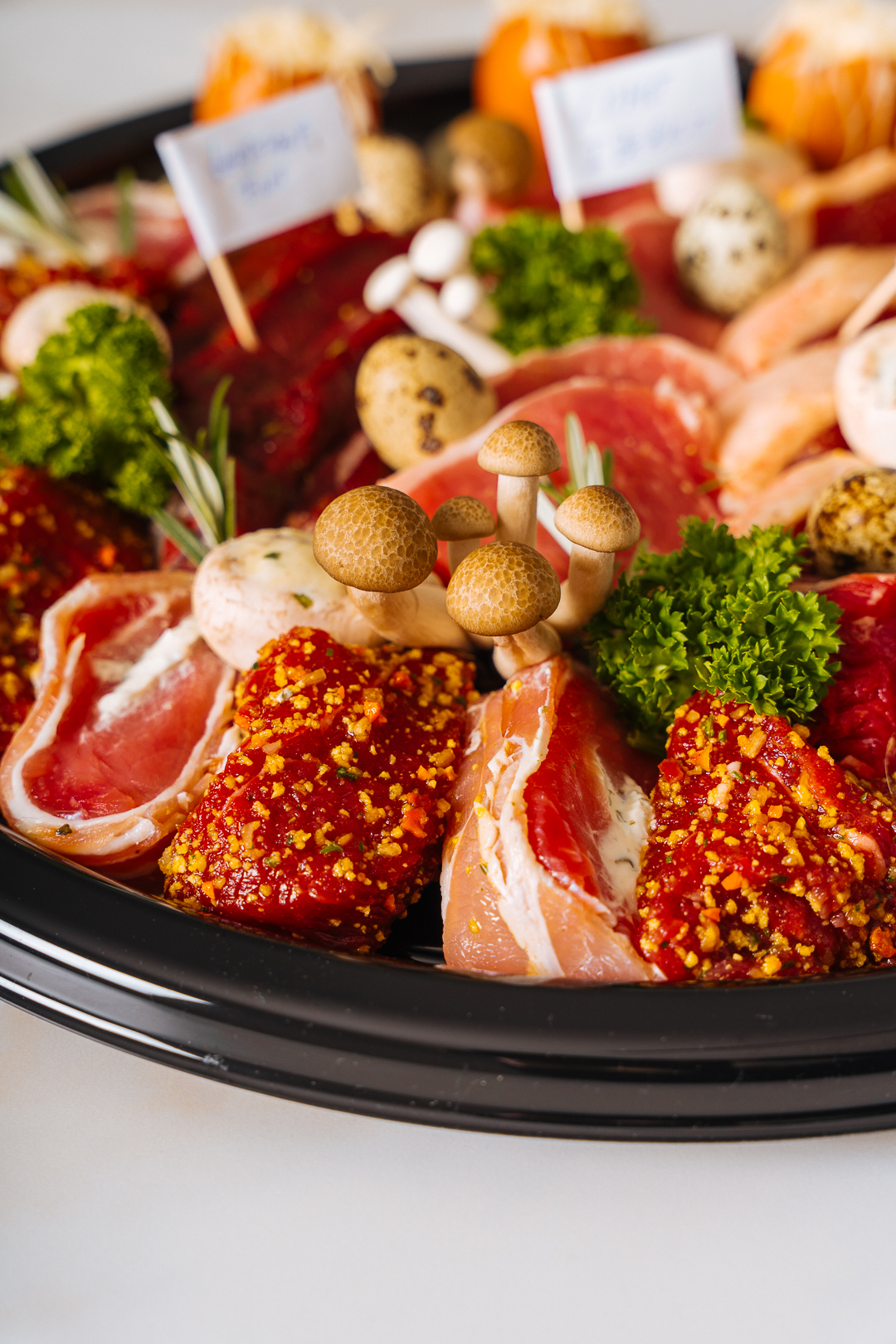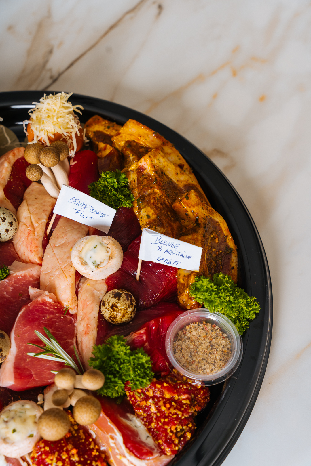 Opgevuld eitje, varkenshaasje/boursin, steak maison, stuk gerijpt vlees uit onze rijpingskast, lomo Iberico, gem. lamskoteletje, hertekalffilet en eendeborstfilet, champignon met lookboter